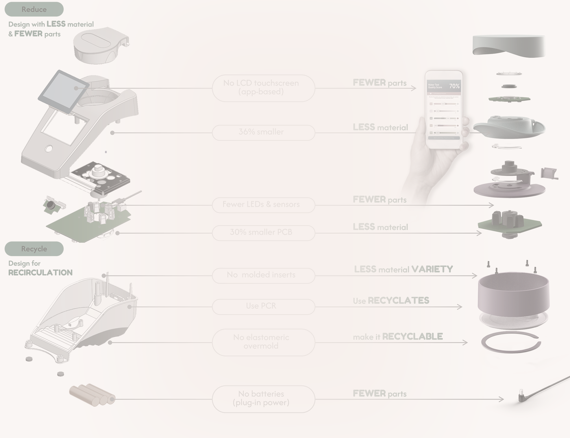 To demonstrate the value of circular design, I led the redesign of a pool water-testing PaaS device and built an in-house team to quantify both environmental and financial impact. Comparing the new circular device with the professional in-store unit revealed significant CO₂ and cost reductions, verified through Life Cycle Assessment (LCA) and should-cost analysis.
